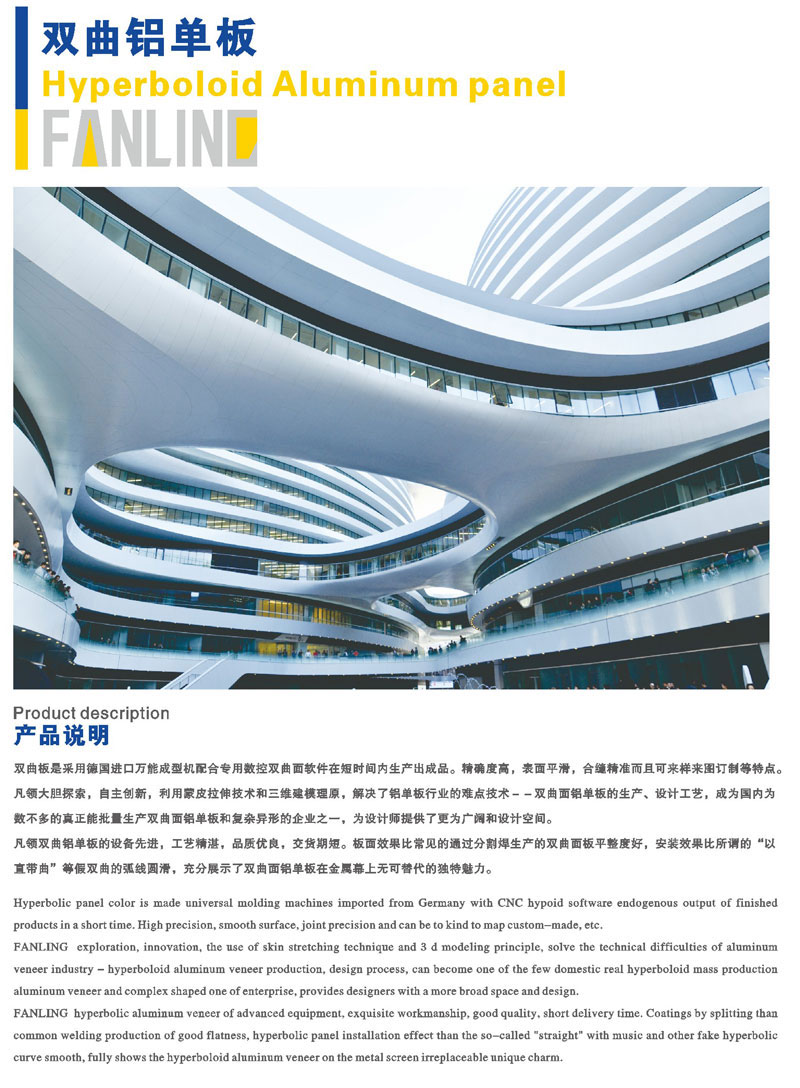 雙曲鋁單板:雙曲板是采用德國進口萬能成型機配合專用數(shù)控雙曲面軟件在短時間內(nèi)生產(chǎn)出產(chǎn)品。精確度高,表面平滑,合縫精準(zhǔn),造型獨特,為設(shè)計師提供了更為廣闊和設(shè)計空間。